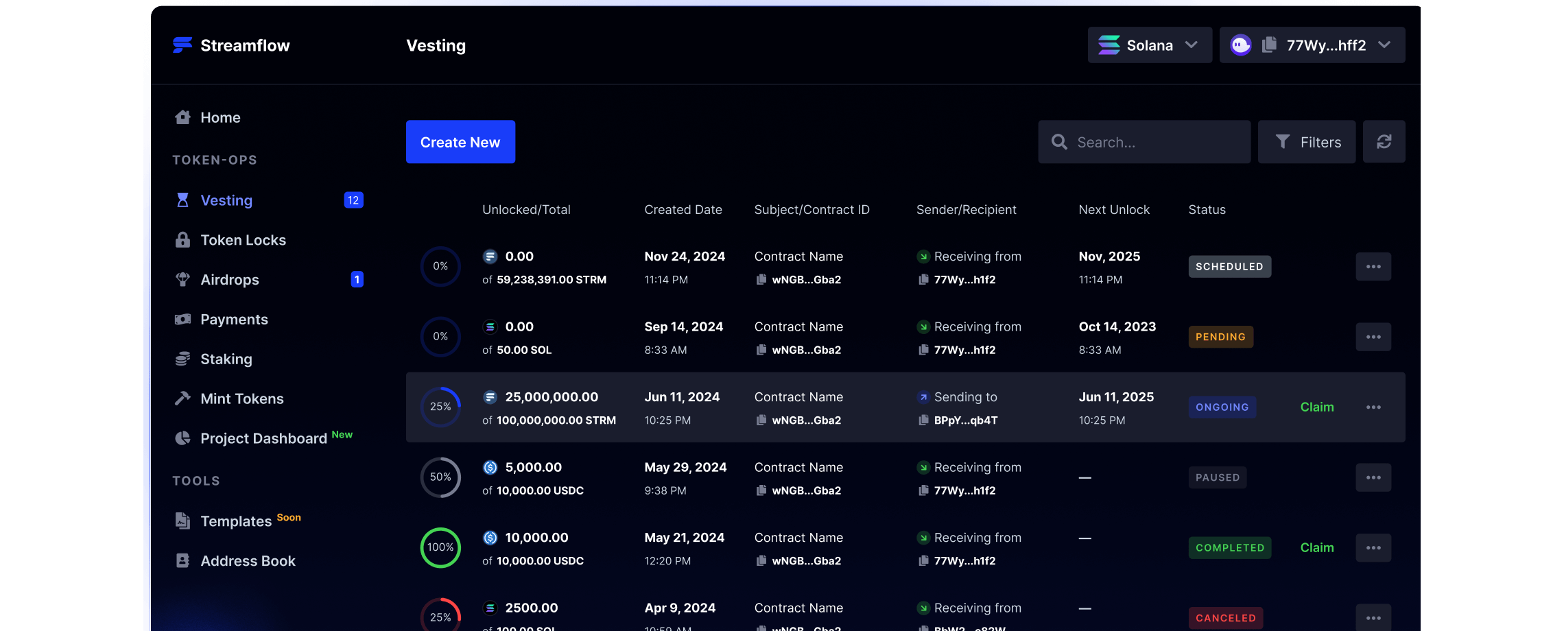 Simplify your token distribution with Streamflow's Application and SDK, offering access to customizable vesting schedules, airdrops, staking, and more.